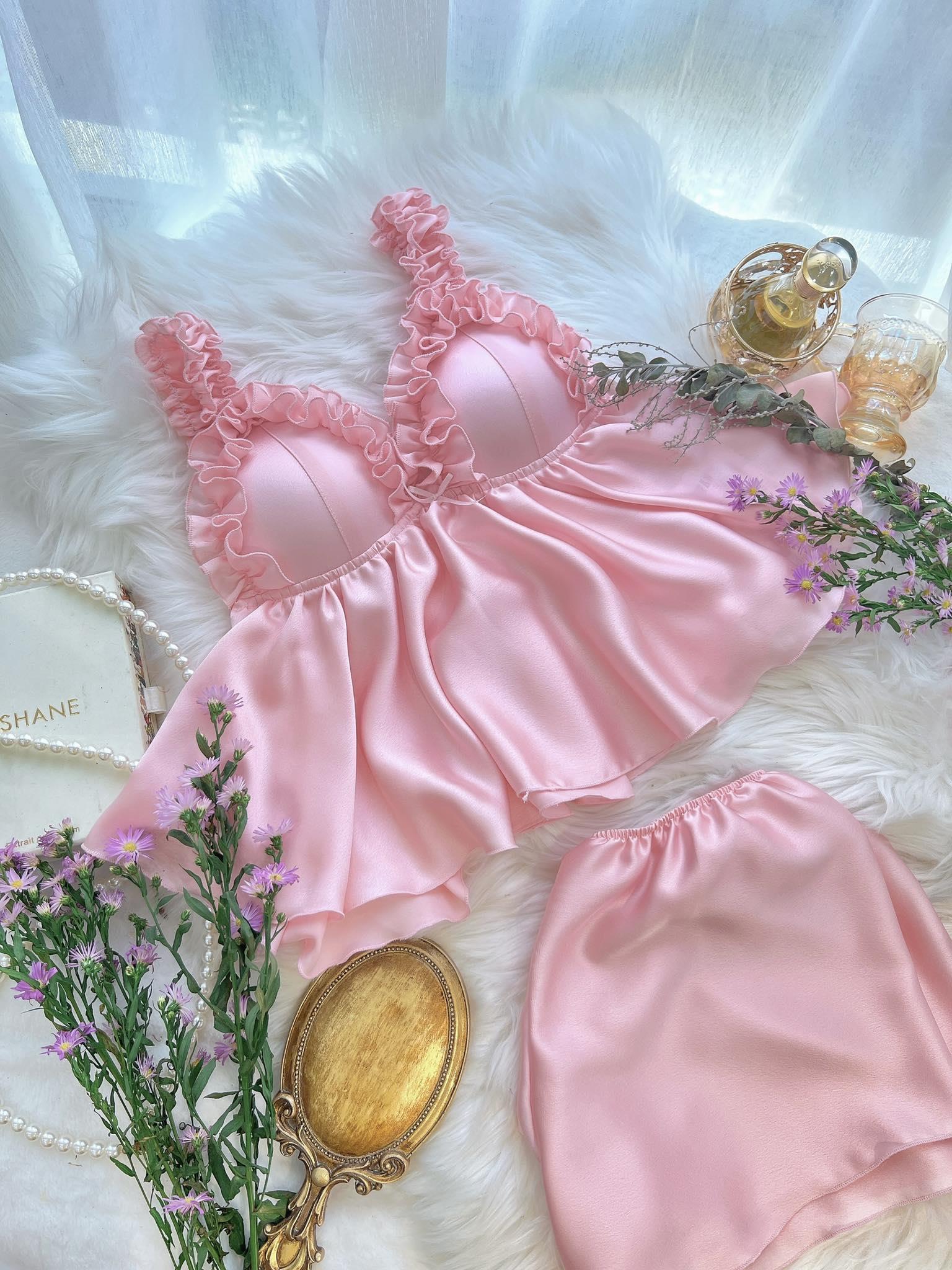 بيجامة شورت ستان حمالة رفيعة مزوده بقصه مميزه من عند الصدر